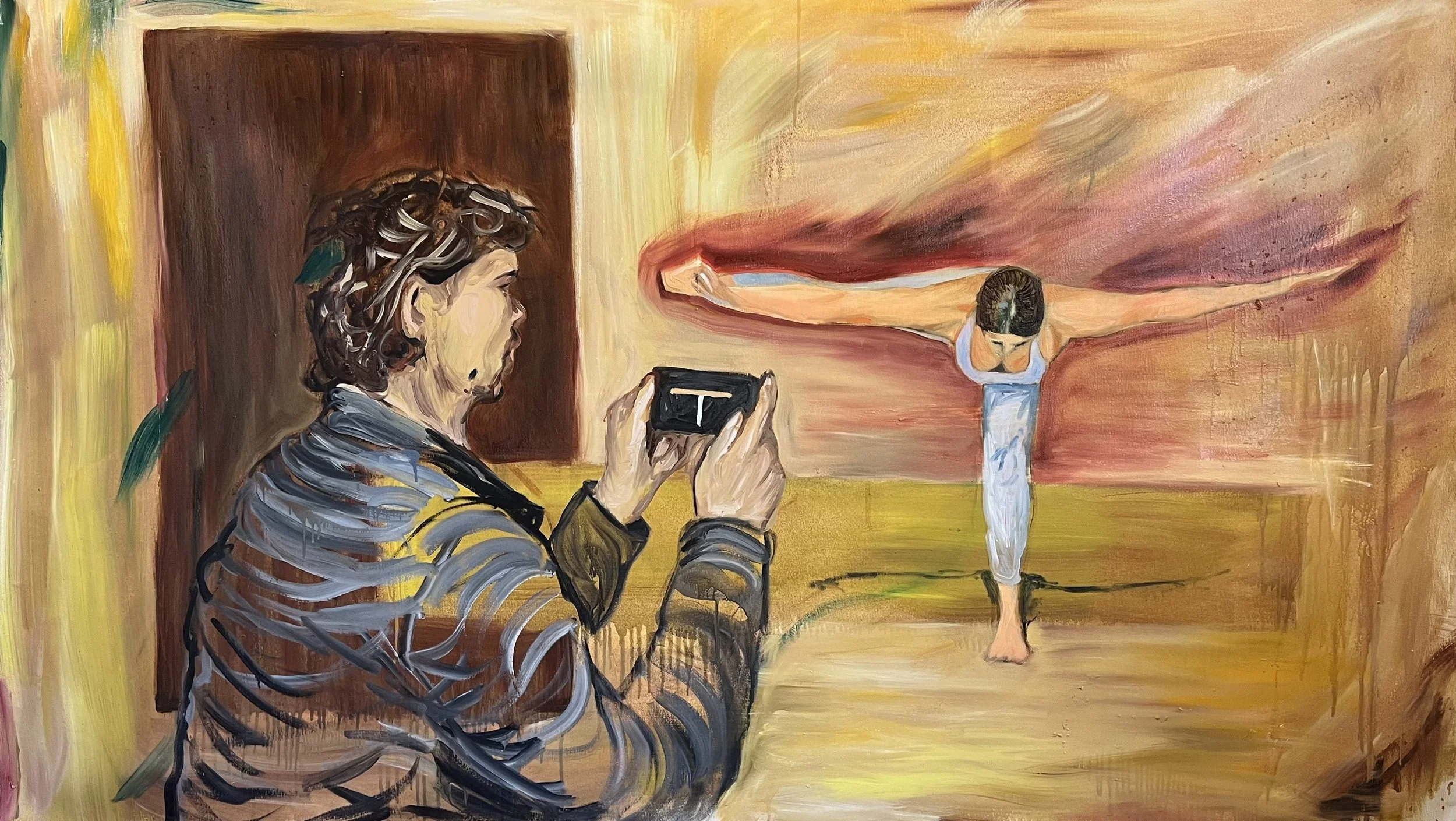 Here a woman is photographed by a man for what will presumably become social media content. Performing a yoga-esque stunt pose, the figure as it appears on camera has been abstracted to its most basic geometric form.