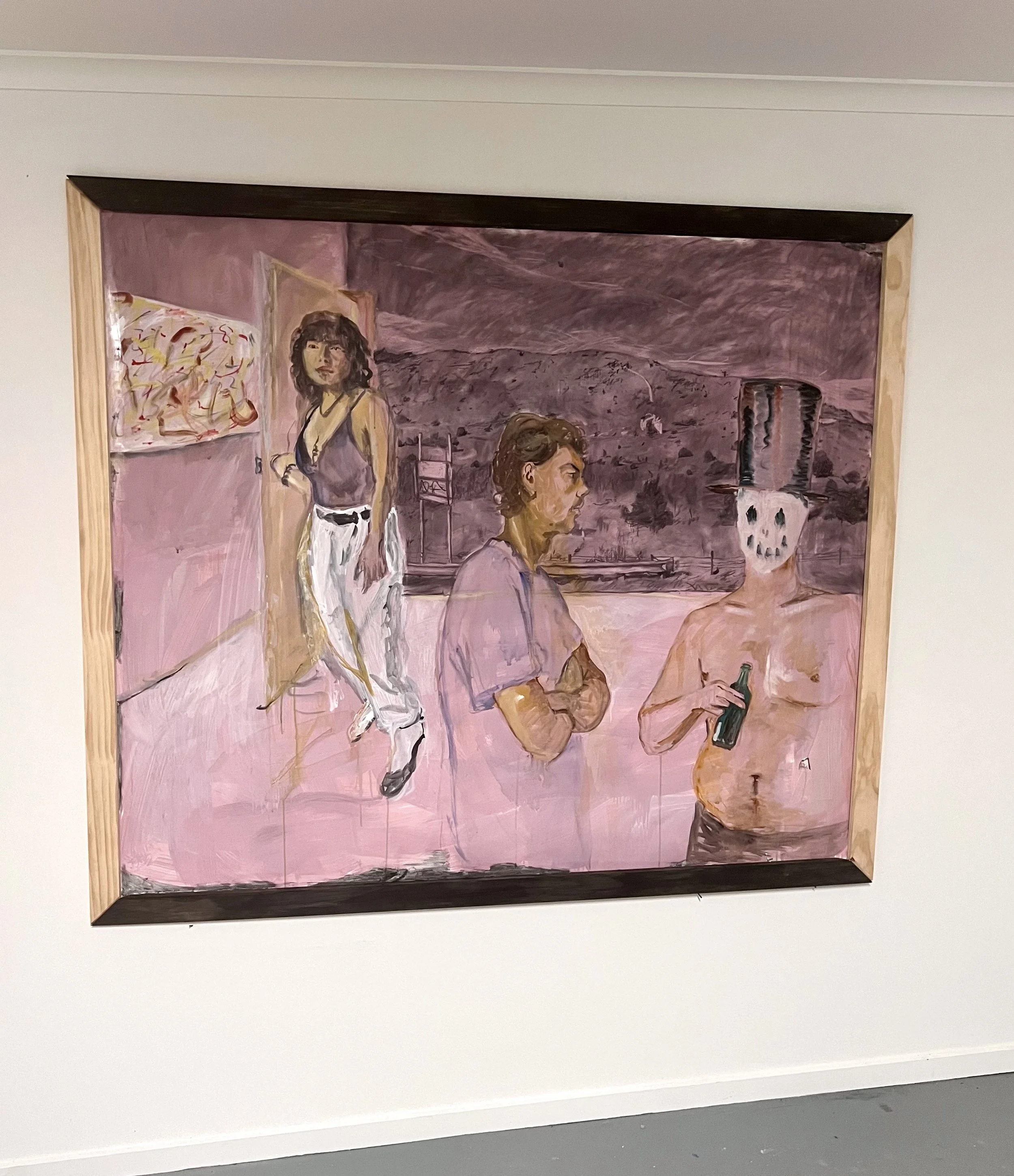 This work is about going to parties in Melbourne and maybe being depressed or maybe being too bogan or maybe not the right amount of bogan. It is titled Poet At The Party but which one is the poet? Maybe I am not the poet. The William Kentridge-esque background represents a bright and desolate scene looking out from the Western Freeway. Thank you to the two life models who assisted me by sitting for this work.